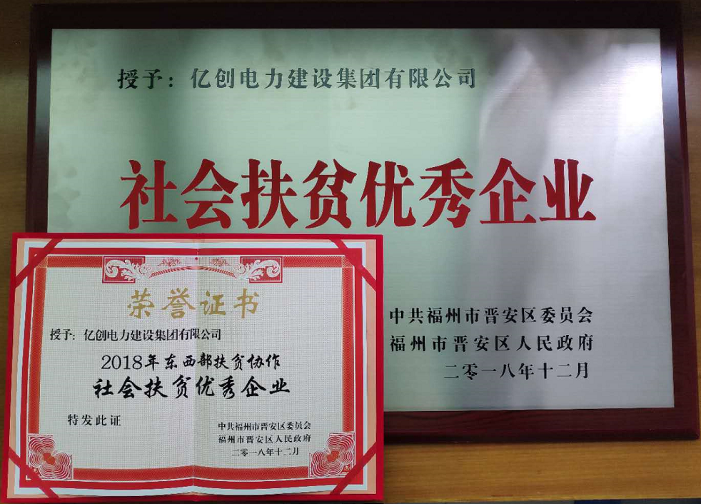 億創電力建設集團全面貫徹落實習近平總書記關于扶貧開發重要戰略思想以及中央、省市關于加強東西部扶貧協作的決策布署,積極響應地方政府的號召,主動承擔社會責任,熱情支持、參與扶貧協作。2018年12月11日,我集團在“2018年晉安區民營經濟發展大會暨東西部扶貧協作社會捐助工作表彰會”上被晉安區委、區政府授予“社會扶貧優秀企業”稱號。